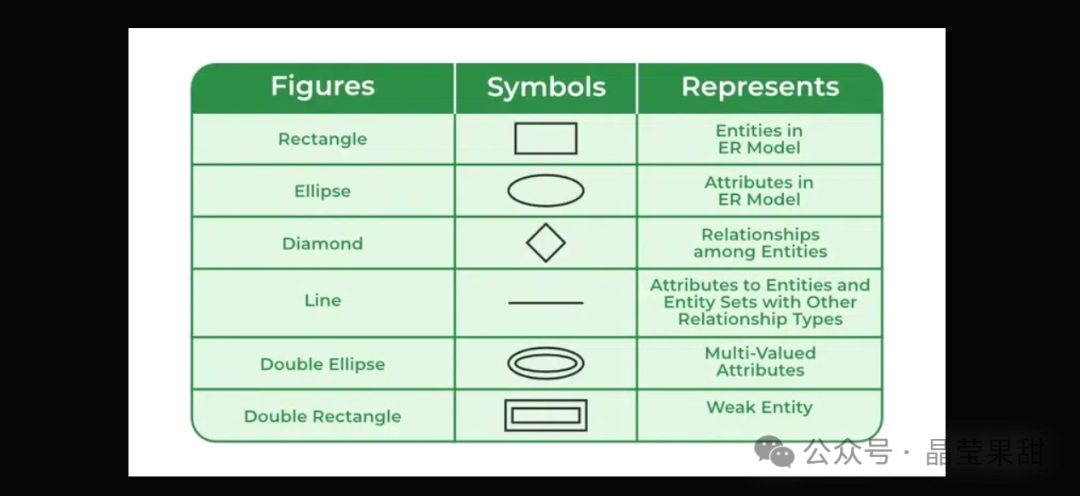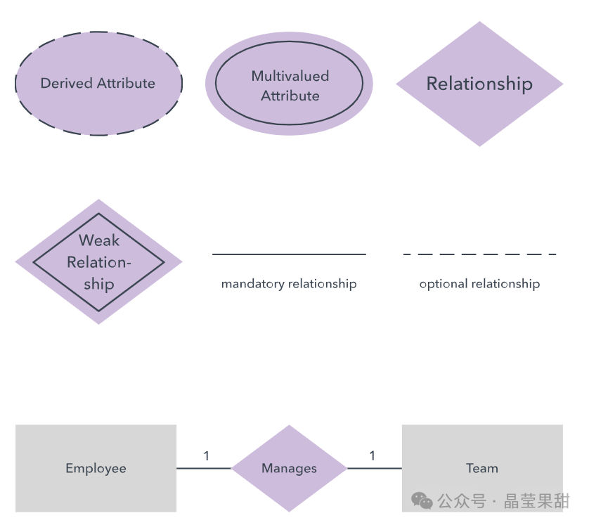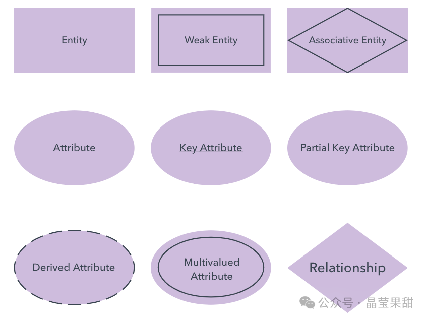 通过以上5W2H的描述,可以更好地理解实体关系图的概念及其在数据库设计中的重要性。ERD常用的符号如下图,通常使用矩形表示实体,椭圆表示属性,菱形表示关系,直线用来连接特定的实体、属性,或者特定的实体与关系。