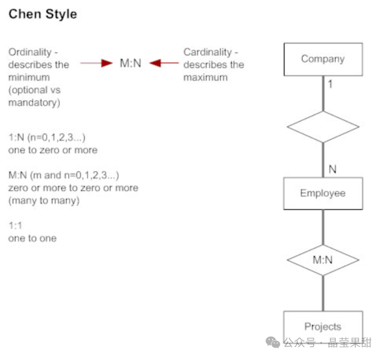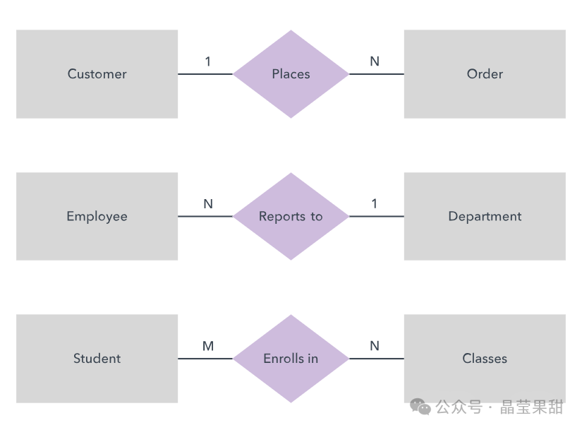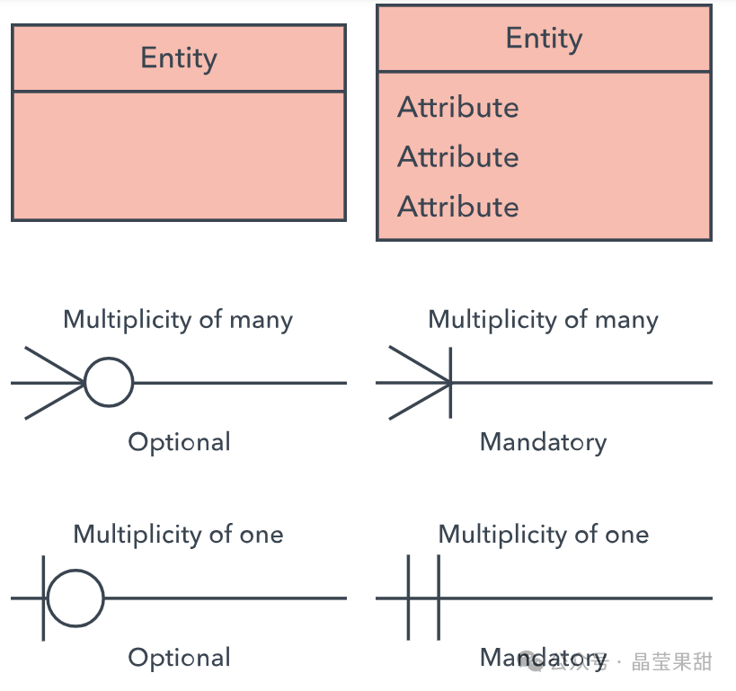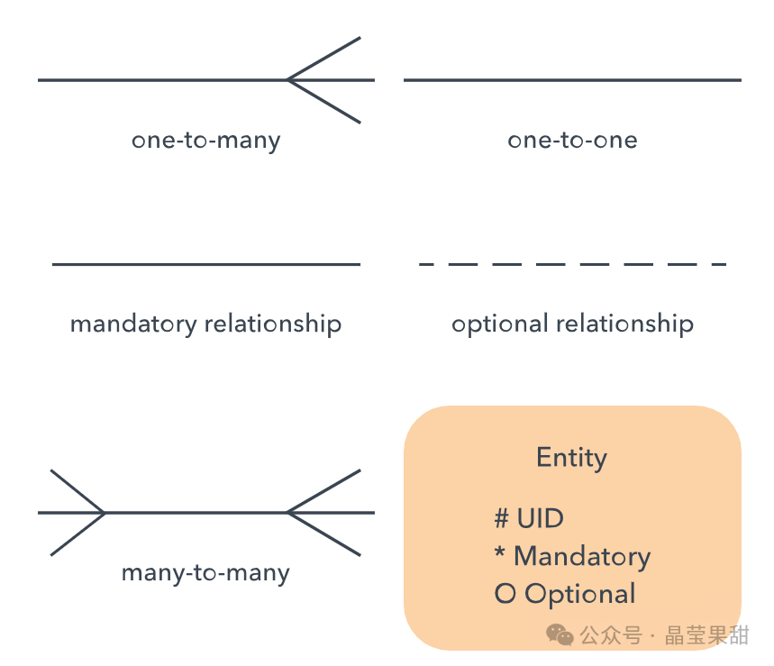 2. Crow's Foot Notation(乌鸦脚表示法): 这种表示法使用不同的符号(如“乌鸦脚”)来表示实体之间的关系类型(如一对多、多对多等)。 常用于商业数据库设计和需求分析。